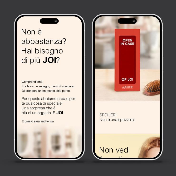 Una volta atterrati sulla landing si veniva accolti da frasi come "Ti stai già rilassando, vero? La tua esperienza nel salone JOICO è appena iniziata" e proseguire con frasi come "Non è abbastanza? Allora abbiamo una sorpresa". A posizionare ancora meglio il carattere della campagna si chiudeva con "Spolier: la sorpresa non è una spazzola".