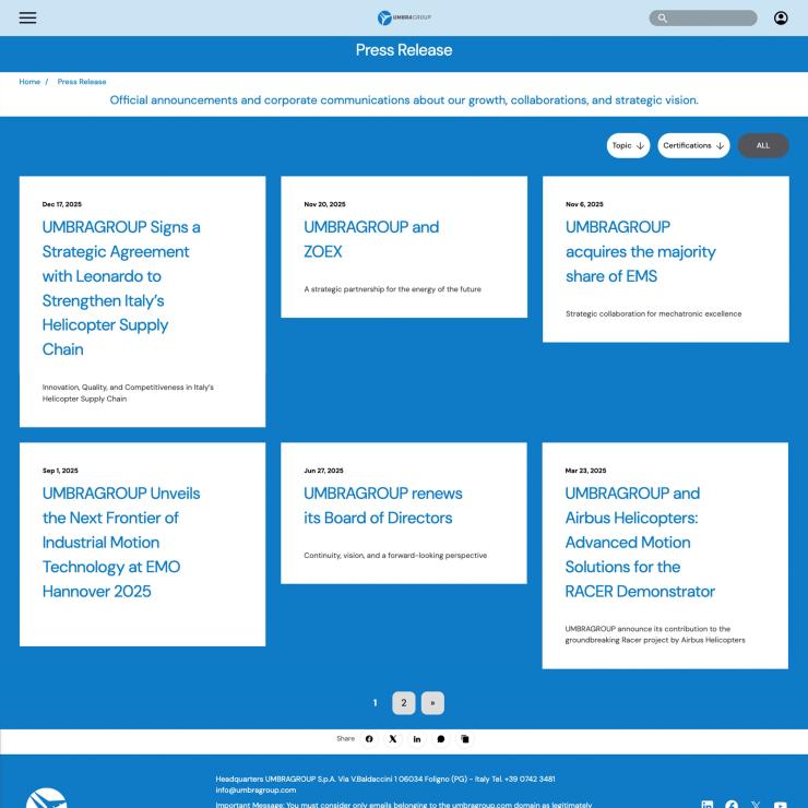 UMBRAGROUP nasce nel 1972 e ha alle spalle una struttura divenuta globale, con sedi presenti in Italia, Germania e Stati Uniti. Esperta nella produzione di componenti meccanici e meccatroniche ad alta precisione per il mercato aerospaziale, questa realtà produce componeneti per aeromobili con più di 100 posti.