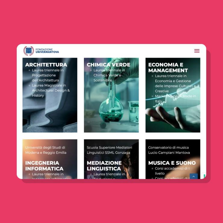 Attraverso un’interfaccia moderna e un linguaggio visivo d'avanguardia, abbiamo restituito a UniverMantova un’immagine istituzionale fresca e autorevole, capace di distinguersi nel panorama accademico e di comunicare innovazione.